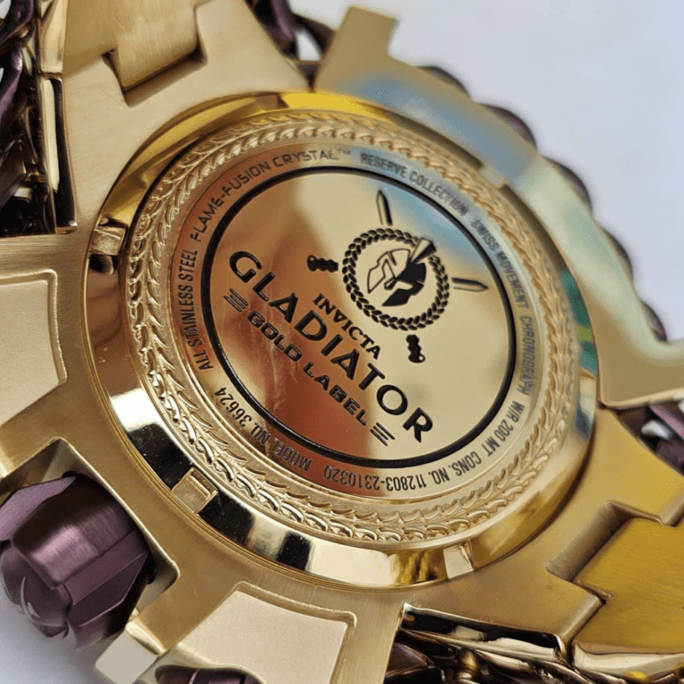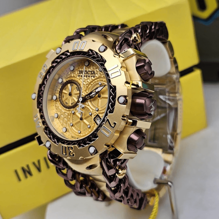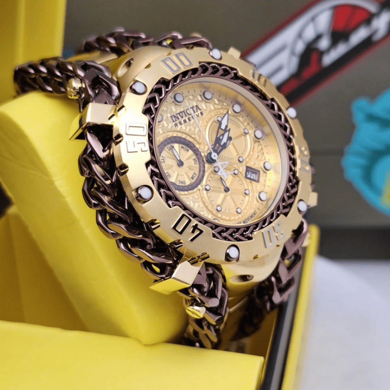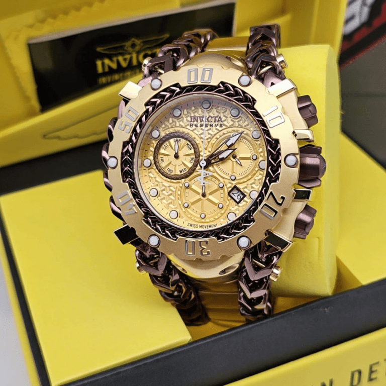Caixa em aço inoxidável dourado com pulseira em aço inoxidável dourado. Luneta fixa em tom dourado com um elo de corrente em ouro rosa embutido. Mostrador dourado com ponteiros luminosos em tom dourado e marcadores de horas com pontos. Marcadores de minutos em torno da borda exterior. Tipo de discagem: analógico. Exibição de data entre as posições de 4 e 5 horas. Dois sub-mostradores exibindo: 60 segundos e 30 minutos. dia da semana. Movimento de quartzo Calibre Invicta Z60. Cristal fundido a fogo e resistente a arranhões. Aparafuse a coroa. Estojo sólido de volta. Forma de caixa redonda. Tamanho da caixa: 55,25 mm. Espessura da caixa: 19 mm. Largura da banda: 41 mm. Comprimento da banda: 8,25 polegadas. Dobre sobre o fecho. A PROVA D’ÁGUA a 200 metros / 660 pés. Funções: cronógrafo, data, hora, minuto, segundo. Série Gladiador. Estilo de relógio casual. Etiqueta do relógio: Fabricado na Suíça. Invicta Gladiator Chronograph Quartz Gold Dial Relógio Masculino 36622.